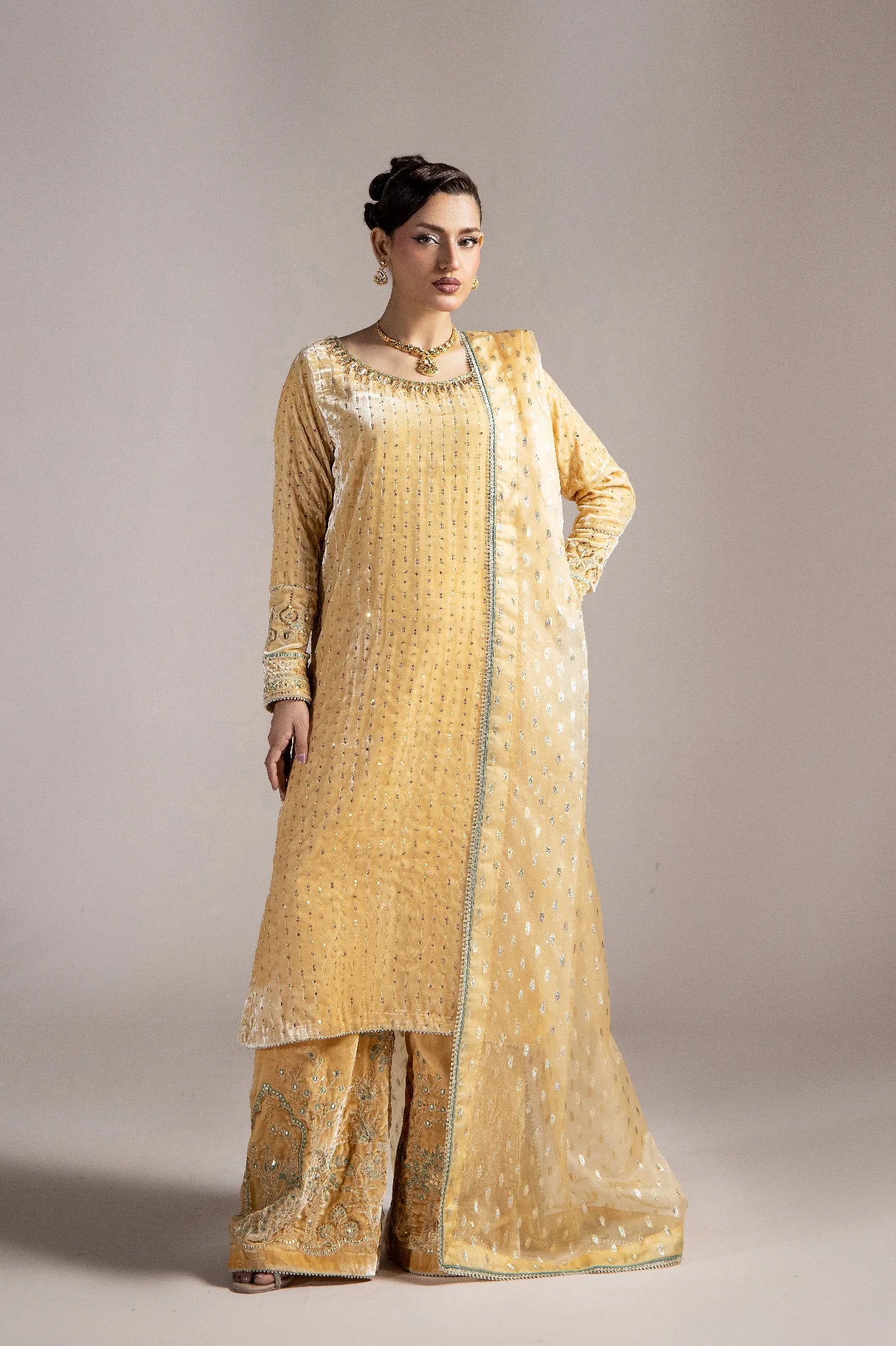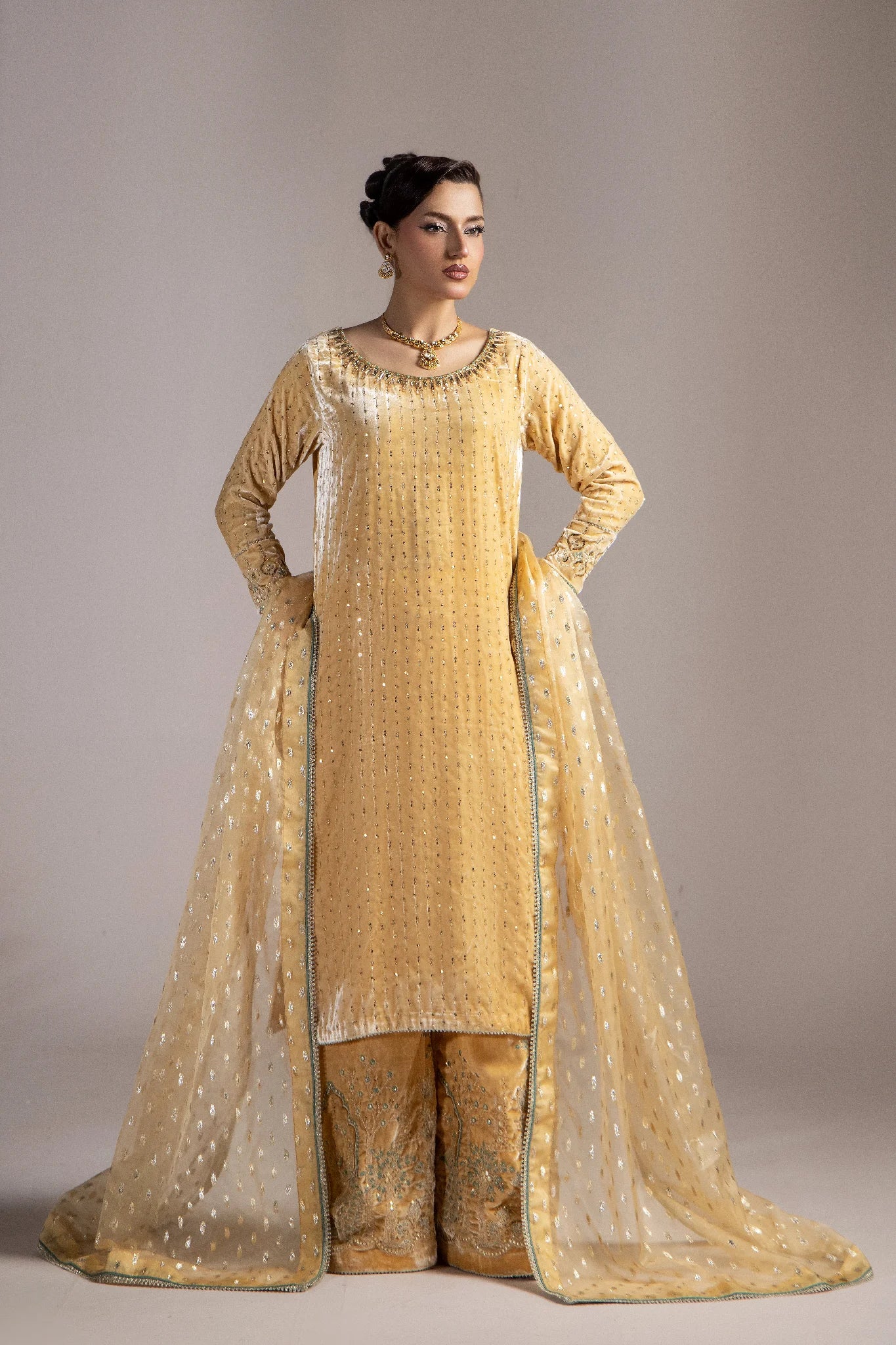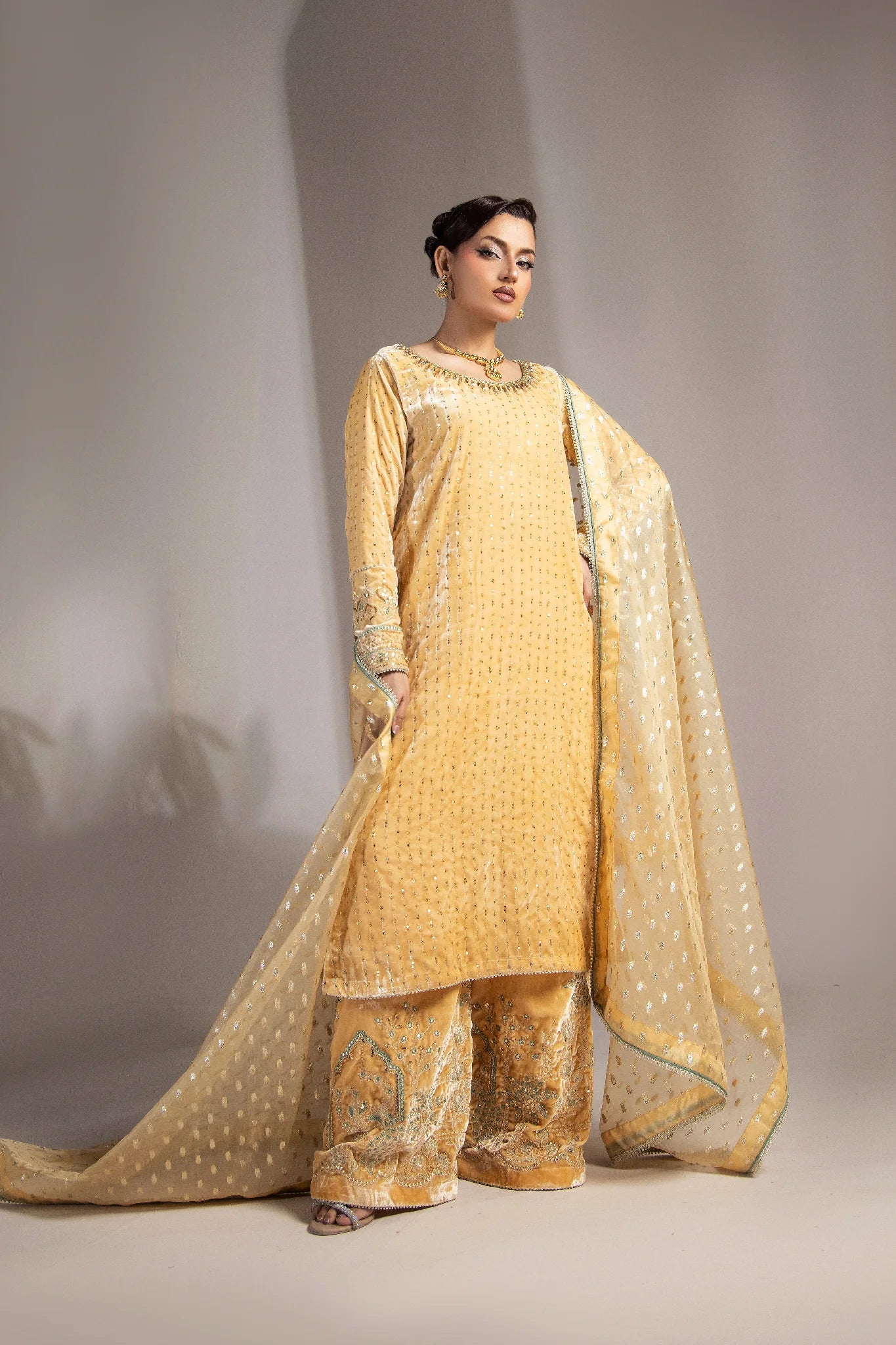 The brochia organza dupatta completes the outfit with a delicate charm — making Elara the perfect choice for winter soirées, festive celebrations, and formal gatherings.