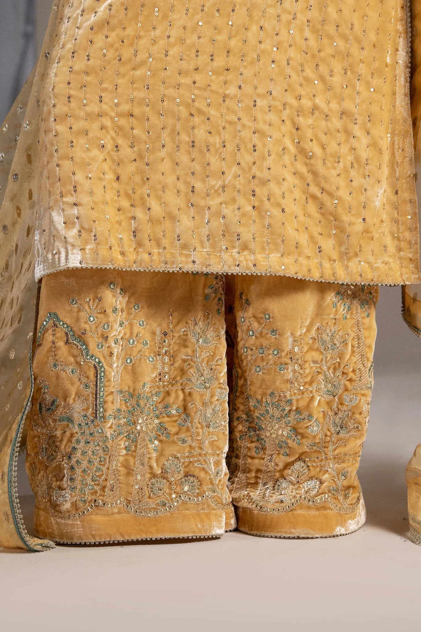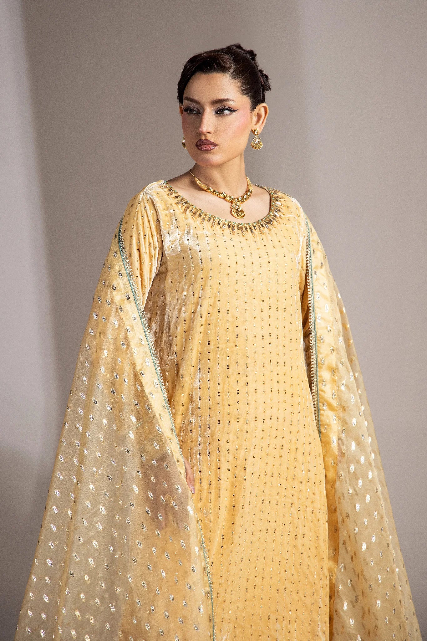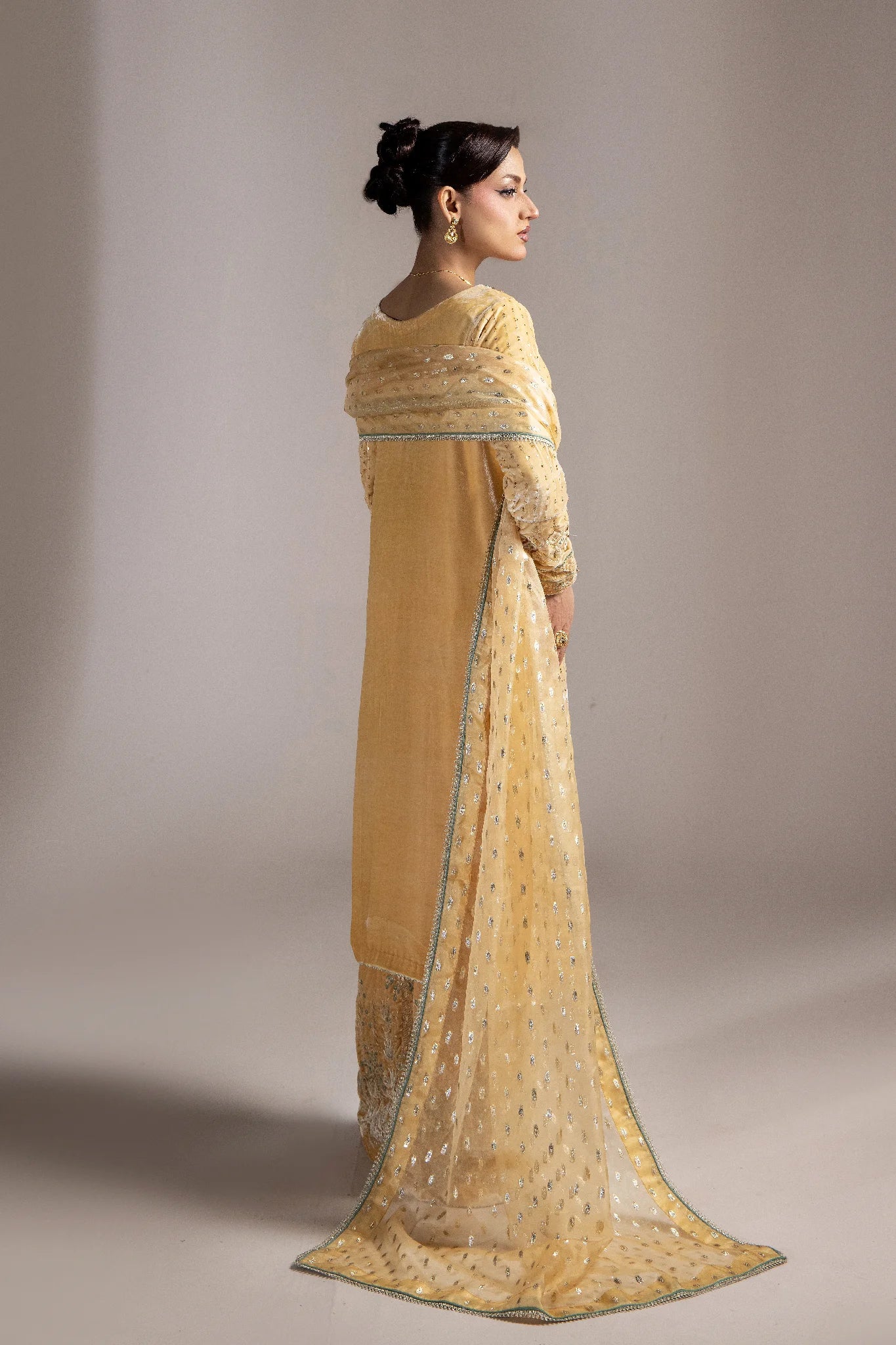 The brochia organza dupatta completes the outfit with a delicate charm — making Elara the perfect choice for winter soirées, festive celebrations, and formal gatherings.