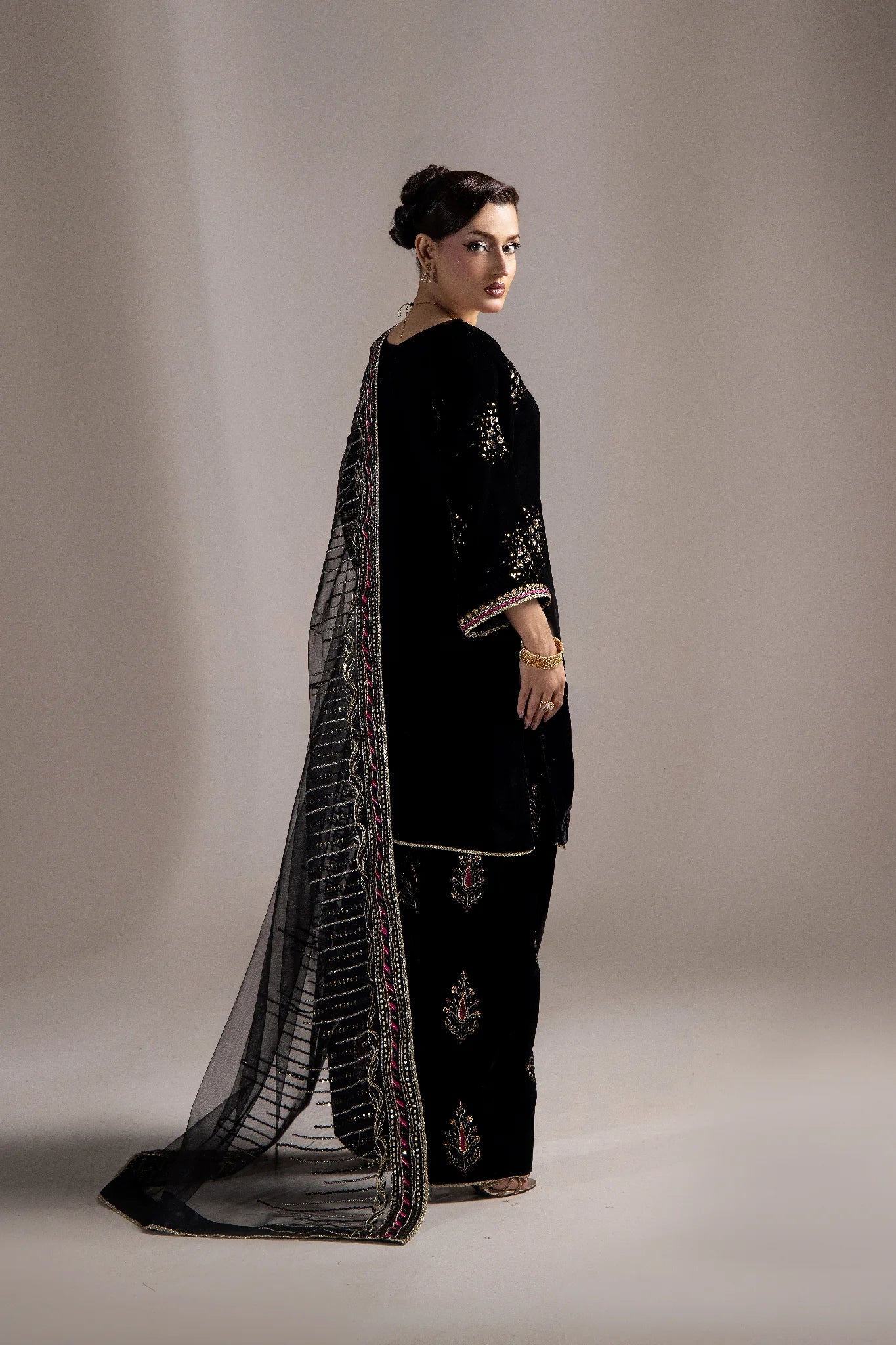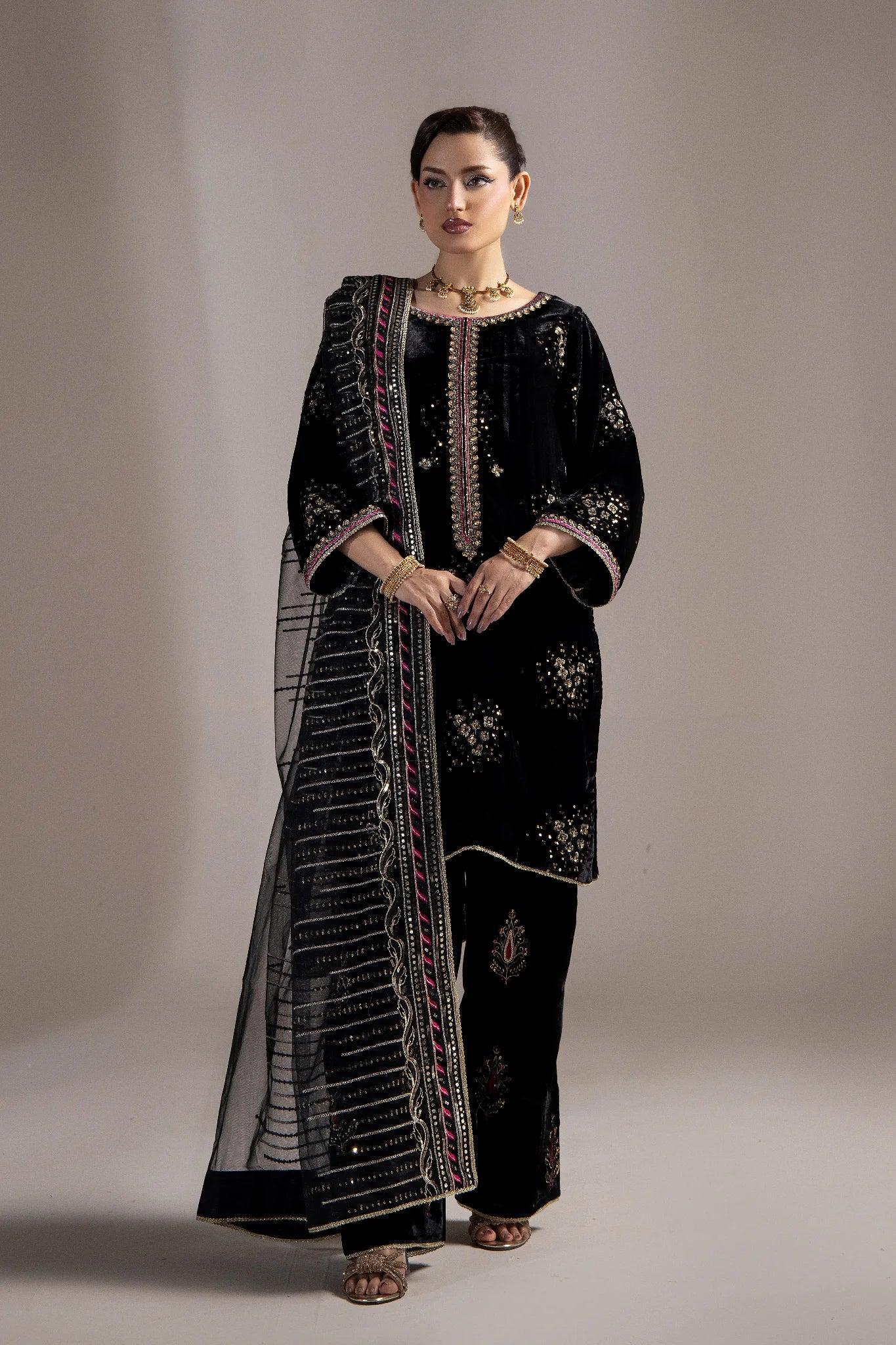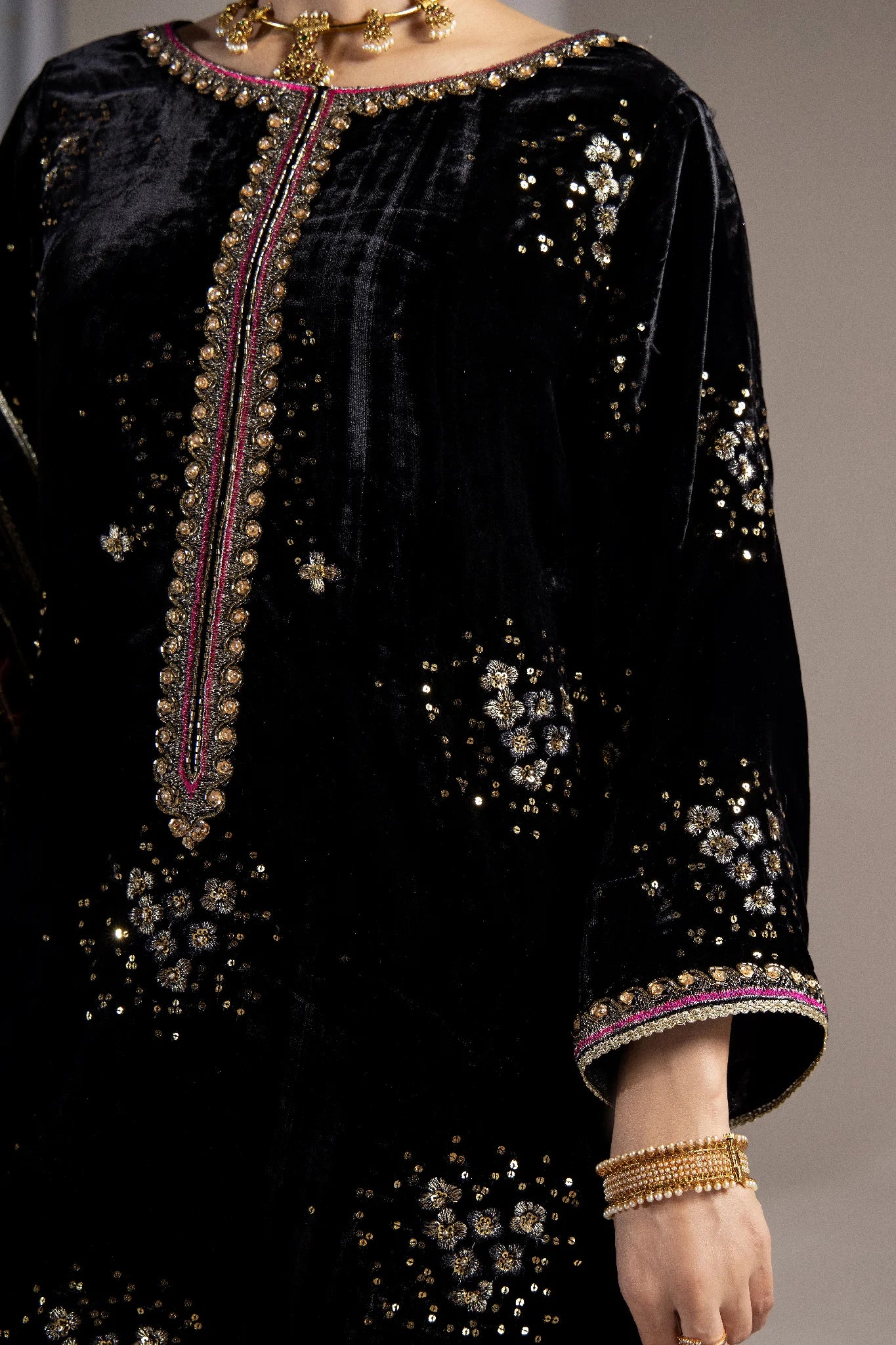 Step into timeless elegance with Nova, a mesmerizing black 3-piece luxury ensemble designed for those who love sophistication with a statement. Crafted from premium velvet and delicate net, this outfit features a short shirt paired with a farshi shalwar, beautifully merging tradition and modern charm.