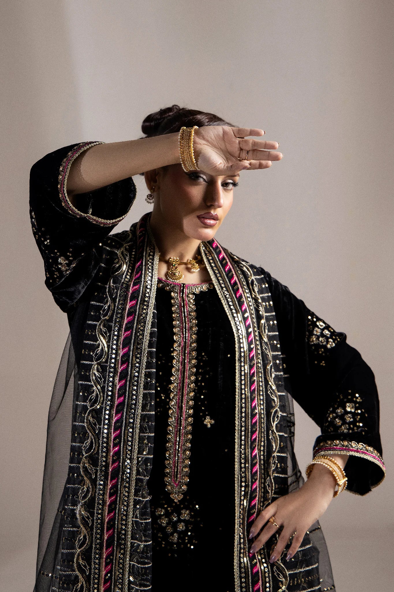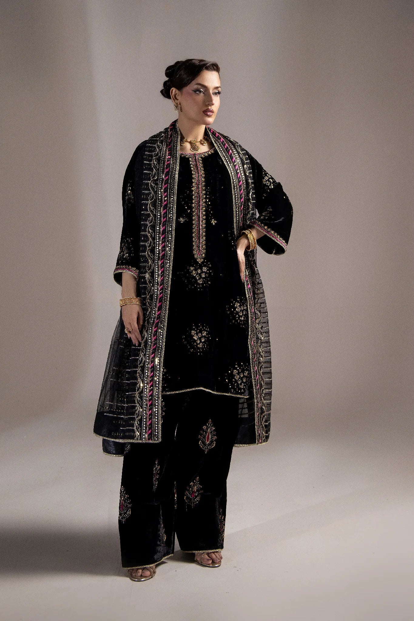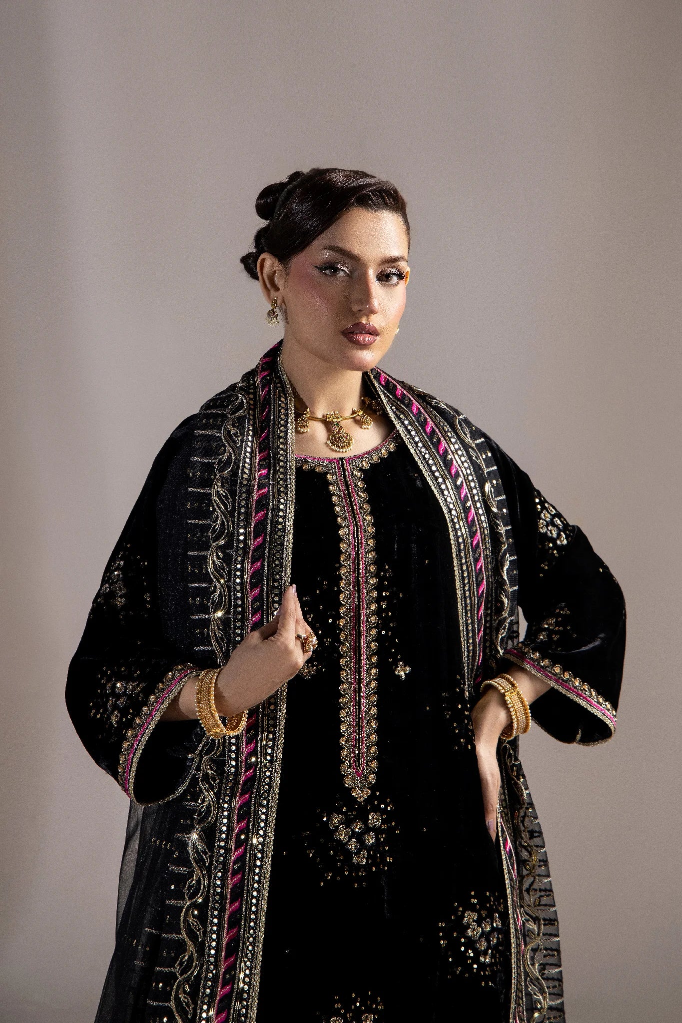 Step into timeless elegance with Nova, a mesmerizing black 3-piece luxury ensemble designed for those who love sophistication with a statement. Crafted from premium velvet and delicate net, this outfit features a short shirt paired with a farshi shalwar, beautifully merging tradition and modern charm.